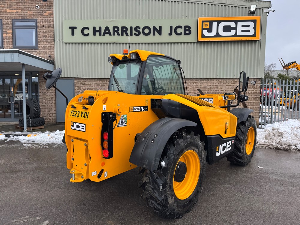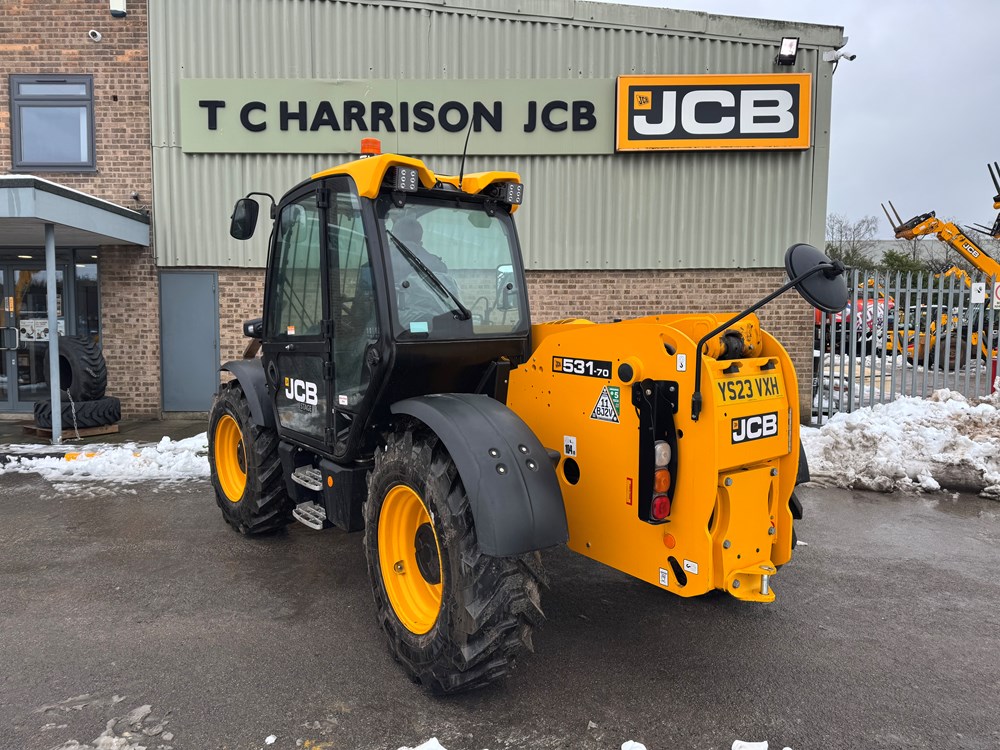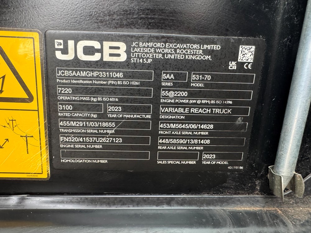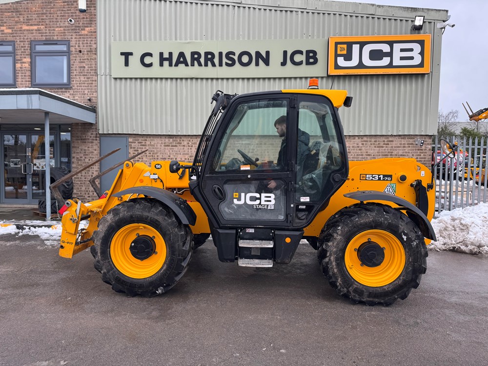 JCB 531-70 LOADALL - 55KW STAGE 5 ENGINE, MANUAL JOYSTICK, 1 LEVER 1 AUX TILT LEVER LOCK, CAB WITH AIR CONDITIONING, FABRIC SUSPENSION SEAT WITH ADJUSTABLE BACKREST, HYDRAUICL Q-FIT CARRIAGE, FRONT & REAR LED WORK LIGHTS, STEER COLUMN: ADJUSTABLE TILT & SLIDE STEER COLUMN, FRONT SCREEN GUARD, RADIO KIT, IMMOBILISER KEY PAD, PALLET FORKS - LOCATION: TCH JCB ALFRETON